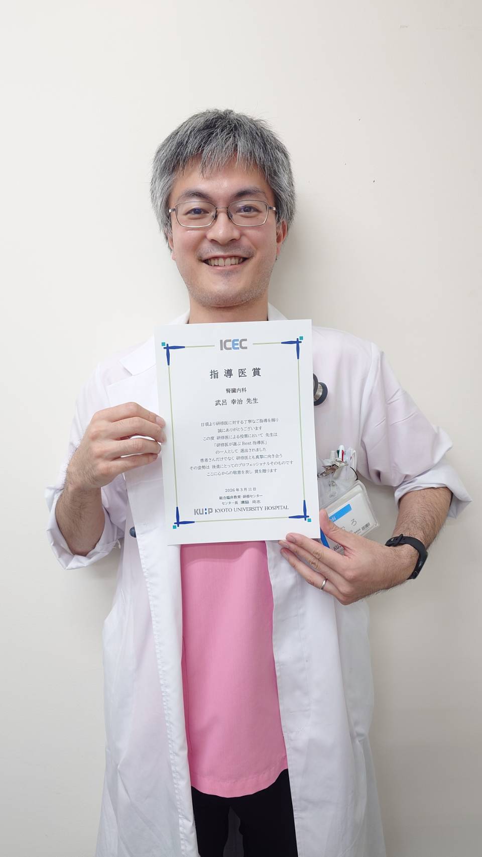 京都大学医学部附属病院では、研修された研修医全員を対象とするアンケート結果に基づき、研修中に出会ったBest指導医として「指導医賞」が選出されます。